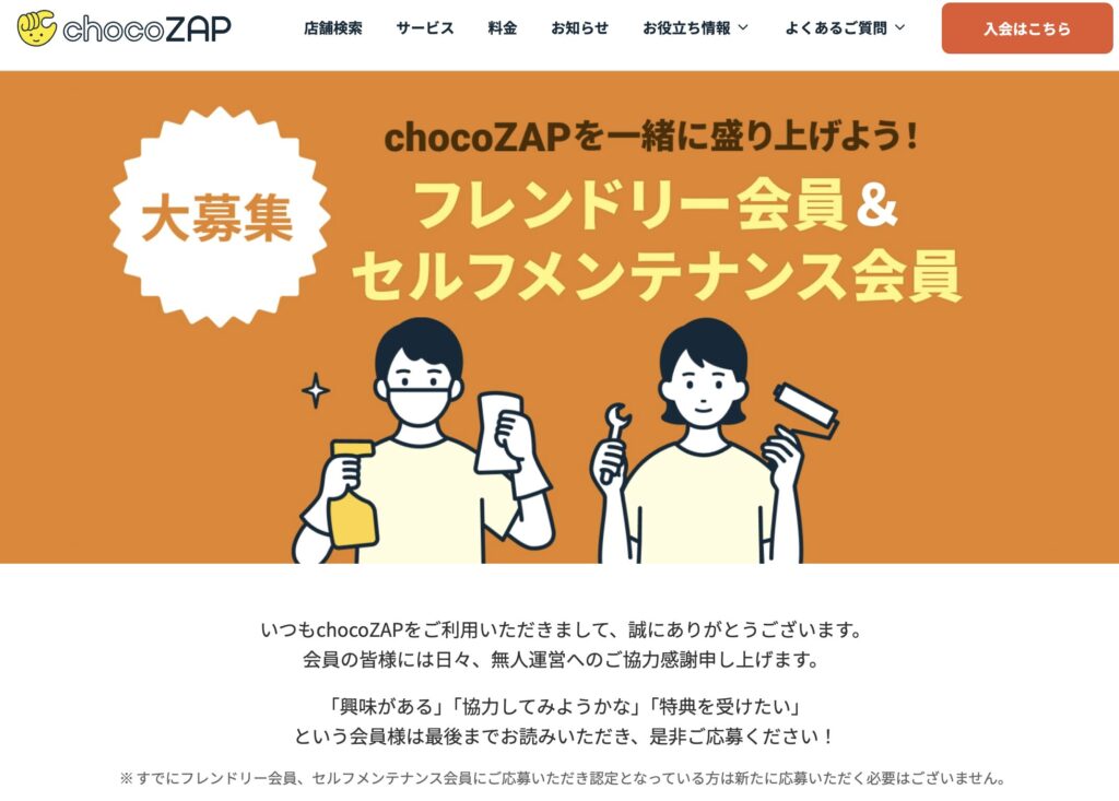 チョコザップではサポート会員として、清掃や備品補充等を担う「フレンドリー会員」と、マシンメンテナンスを担う「セルフメンテナンス会員」を設定しています。