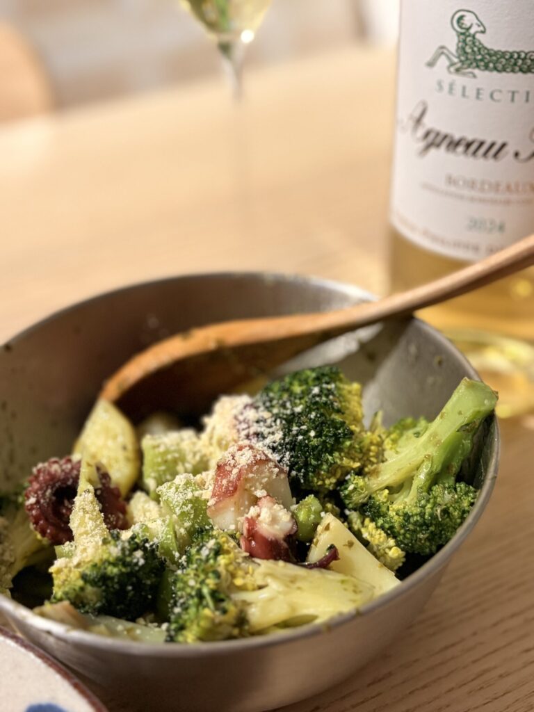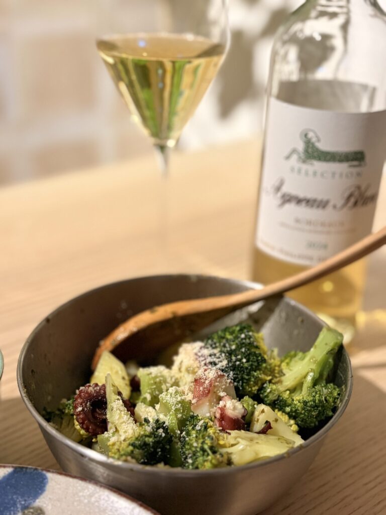続いて、バジルサラダを一口。 タコの食感とバジルの爽やかさが、アニョー・ブランのハーブのような香りと共鳴します。